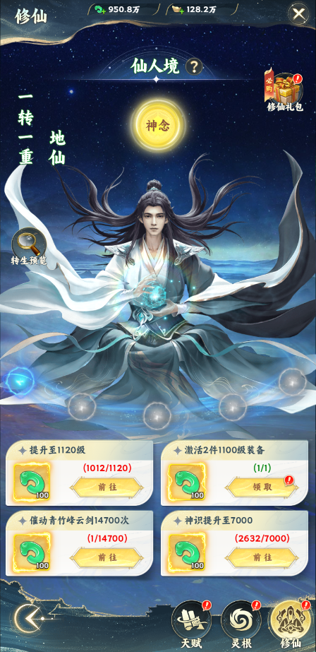 玩家完成修仙任務(wù)后可以領(lǐng)取任務(wù)獎勵,全部任務(wù)完成后,點(diǎn)擊破境按鈕,可以提高轉(zhuǎn)生重數(shù),轉(zhuǎn)生重數(shù)滿后則提升轉(zhuǎn)生等級。提升轉(zhuǎn)生等級會大幅提升角色的屬性,達(dá)到目標(biāo)的轉(zhuǎn)生等級后,還會開放神識,大幅度提升角色戰(zhàn)力。