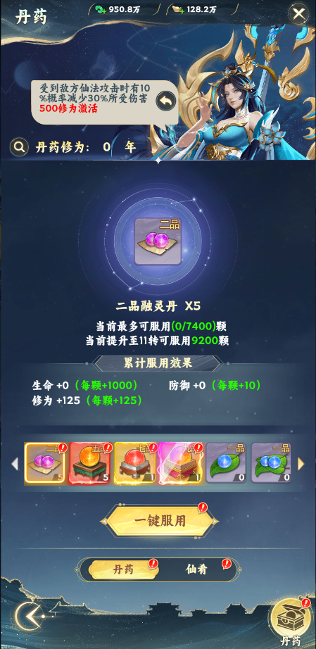 玩家一轉(zhuǎn)開啟丹藥,玩家可通過食用丹藥和美食提升玩家屬性和對應(yīng)的丹藥修為和美食修為,當(dāng)修為到達(dá)一定值還會獲得特殊增益效果。