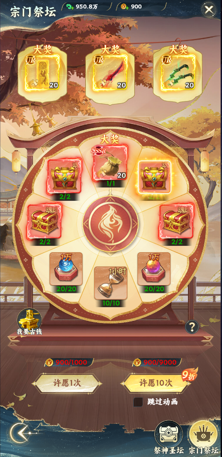 玩家可以通過消耗宗門鑄幣在宗門祭壇中抽獎勵,獎勵抽一少一,抽中極品獎勵可消耗仙玉刷新祭壇獎勵。獎勵抽取完可免費刷新。