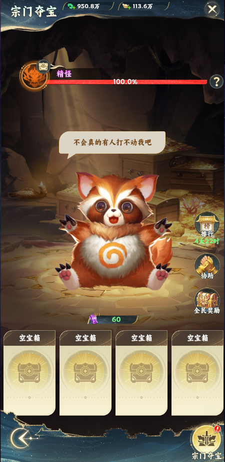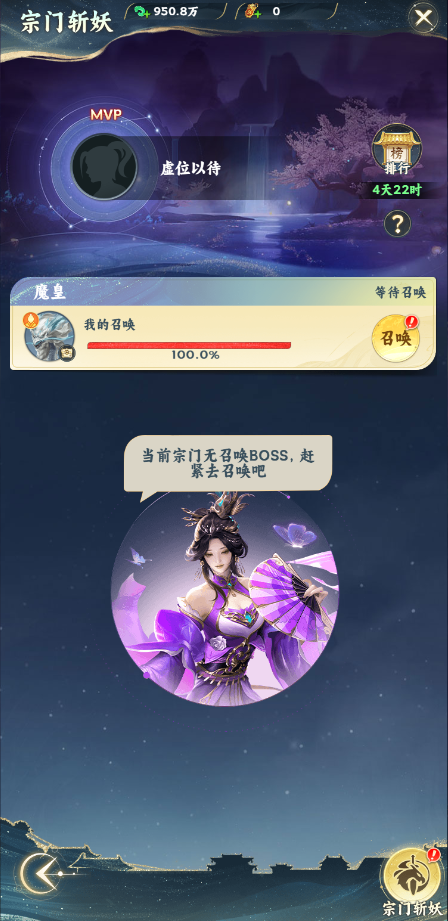 宗門每日發(fā)放一張斬妖召喚符。玩家可消耗斬妖召喚符,召喚出妖怪,宗門成員擊殺后,全宗門的成員都可領取獎勵。宗門等級到達10級,可一鍵領取所有擊殺獎勵。每周會根據(jù)封妖積分進行排名,排名分個人排名和宗門排名,結算后可以領取排名獎勵。