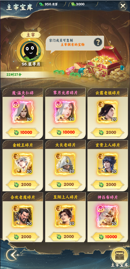 任意宗門成員擔任主宰職務后,所有宗門成員可打開主宰寶庫,主宰寶庫隨機刷新9項主宰所擁有的伙伴,仙術,玩家消耗道具可以在主宰寶庫中的神將的仙術。系統(tǒng)每天0:00自動指派戰(zhàn)力最高的宗門成員為主宰。宗門首座每天有一次機會指派一名成員擔任主宰。