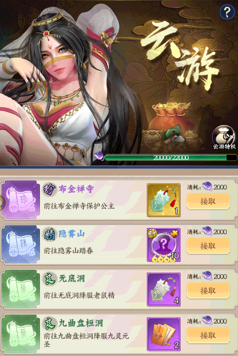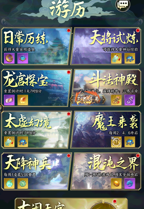 六、參與游歷、仙人渡、萬界天門里的游戲活動可以獲得各種稀有道具和積分。建議每天都把這三個地方,能推進的推進,能打的打,不要留次數(shù),能獲得大量提升用的材料