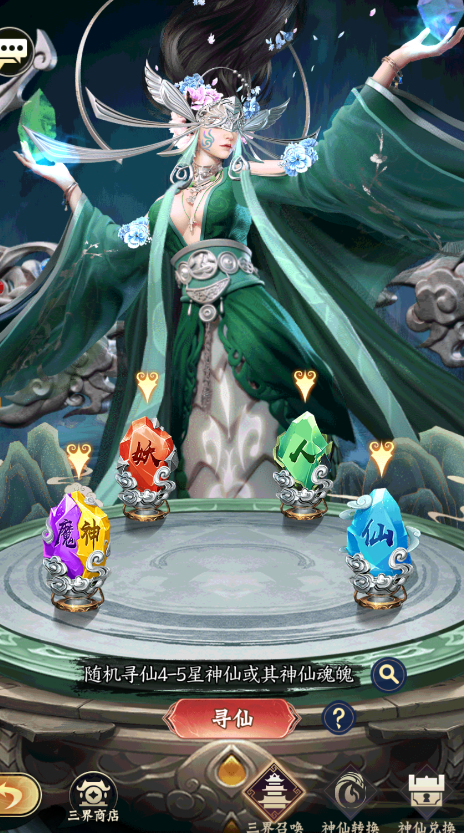 二、獲得神仙的主要途徑是尋仙和三界召喚,尋仙分為天界尋仙、下界尋仙和仙緣尋仙三個卡池,三個卡池獲得的神仙品質(zhì)不盡相同,可以消耗仙玉、仙緣點或者尋仙令召喚神仙。三界召喚可以消耗三界召喚令召喚指定種族的神仙,同時還能通過神仙轉(zhuǎn)換和神仙兌換,獲得想要的神仙