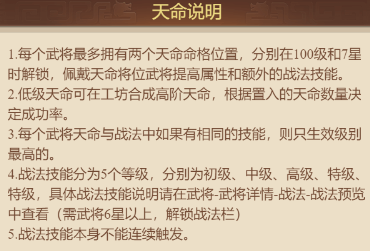 3.每個(gè)武將天命與戰(zhàn)法中如果有相同的技能,則只生效級(jí)別最高的。4.戰(zhàn)法技能分為5個(gè)等級(jí),分別為初級(jí)、中級(jí)、高級(jí)、特級(jí)特級(jí),具體戰(zhàn)法技能說明請(qǐng)?jiān)谖鋵?武將詳情-戰(zhàn)法-戰(zhàn)法預(yù)覽中查看(需武將6星以上,解鎖戰(zhàn)法欄)5.戰(zhàn)法技能本身不能連續(xù)觸發(fā)。