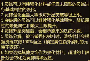 5.?靈飾分解、被當(dāng)做強(qiáng)化材料時(shí),洗練材料會(huì)根據(jù)洗練次數(shù)100%返還 (鎖定屬性額外消耗的元寶不返還)。