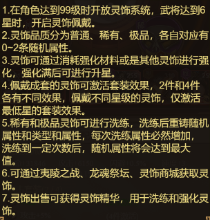2.?靈飾品質(zhì)分為普通、稀有、極品,各自對(duì)應(yīng)有0-2條隨機(jī)屬性。