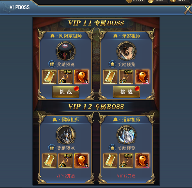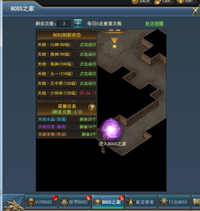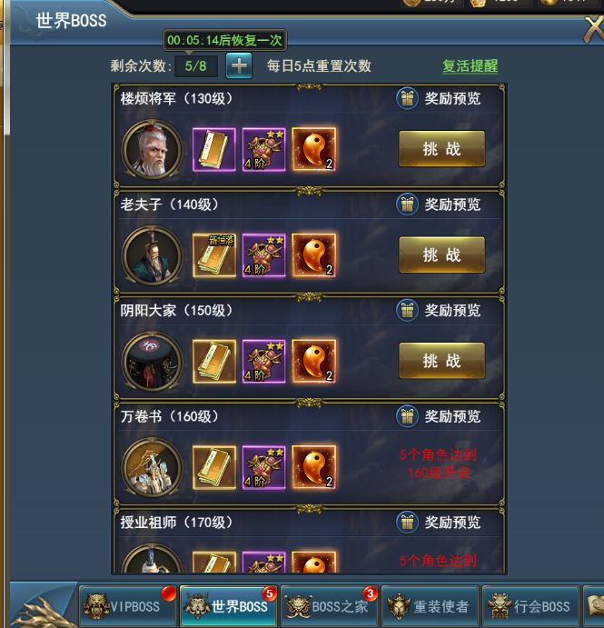 每個(gè)VIP BOSS每日只能挑戰(zhàn)一次,每日5點(diǎn)將重置可挑戰(zhàn)的最高等級(jí)的兩個(gè)VIPBOSS挑戰(zhàn)次數(shù)。