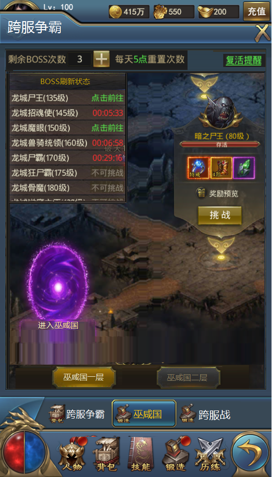 巫咸國(guó)是一個(gè)跨服玩法,多個(gè)服務(wù)器的玩家將在同一個(gè)場(chǎng)景中競(jìng)爭(zhēng)BOSS歸屬。巫咸國(guó)為一個(gè)獨(dú)立的玩法地圖,場(chǎng)景中有多個(gè)不同等級(jí)的BOSS房間入口。