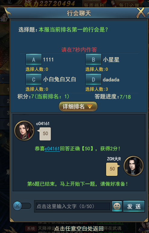 進(jìn)入場(chǎng)景后系統(tǒng)將依次提出一定數(shù)量的選擇題或搶答題,場(chǎng)景中參與的玩家根據(jù)回答的速度與準(zhǔn)確度累計(jì)積分,答題結(jié)束后將根據(jù)積分排行榜發(fā)放活動(dòng)獎(jiǎng)勵(lì)。