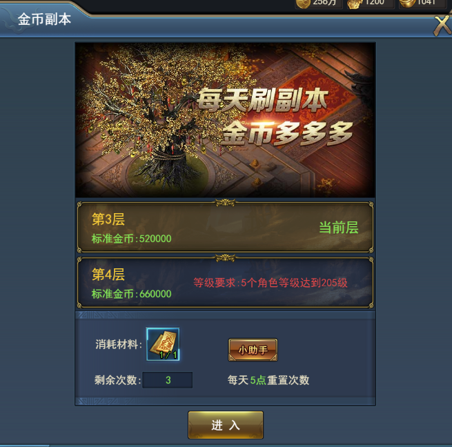 消耗金幣副本門(mén)票可從主城NPC處進(jìn)入金幣副本,當(dāng)角色達(dá)到一定等級(jí)條件時(shí)會(huì)自動(dòng)解鎖更高的副本層數(shù)。