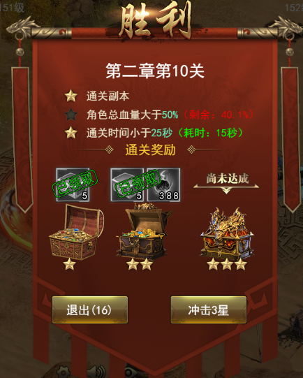 戰(zhàn)斗勝利后將根據(jù)本場(chǎng)的表現(xiàn)決定通關(guān)星級(jí),若達(dá)到三星即可獲得所有獎(jiǎng)勵(lì),并解鎖下一關(guān)的挑戰(zhàn)資格。