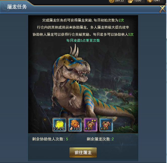 屠龍任務(wù)通過(guò)行會(huì)界面進(jìn)入,在副本內(nèi)擊殺遠(yuǎn)古巨龍即可完成任務(wù)并領(lǐng)取任務(wù)獎(jiǎng)勵(lì)。