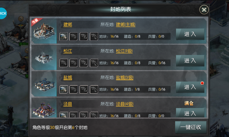 封地建筑一共有16個(gè)可升級(jí)地塊,6個(gè)需要用元寶開啟;官府可升級(jí),不可拆除;其他建筑均可升級(jí)、拆除:不同城市創(chuàng)建基地最高等級(jí)不同,資源加成、兵種的招募速度也會(huì)有一些差異;其他16個(gè)地塊可以根據(jù)個(gè)人喜歡建兵營(yíng)、銅礦場(chǎng)、伐木場(chǎng)、民居、農(nóng)田;