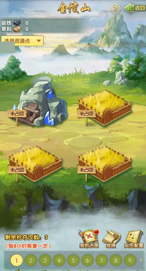 配合蓄馬場的出現(xiàn),金陵山的相關(guān)玩法也開啟了。游戲中,掌門可在金陵山中通過占領(lǐng)資源點(diǎn)獲取資源,而資源點(diǎn)分為鐵礦場和草料場兩種,鐵礦場生產(chǎn)鑌鐵,草料場生產(chǎn)草料。需要注意的是,每個(gè)弟子最多只能占領(lǐng)兩個(gè)資源點(diǎn),搶奪和防守都會(huì)以隊(duì)伍為單位進(jìn)行,掌門需要合理分配隊(duì)伍,一個(gè)隊(duì)伍最多放置3名弟子。