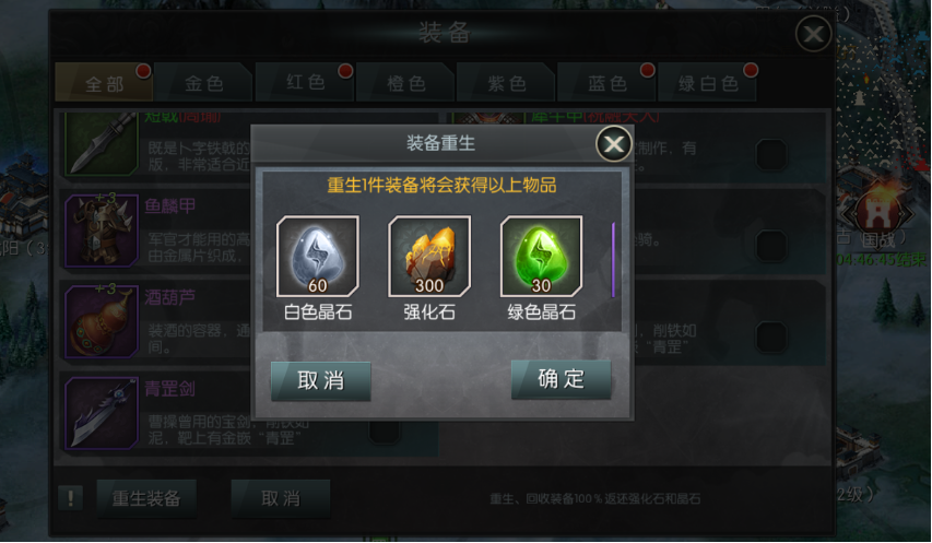 強(qiáng)化百分百成功,裝備最高強(qiáng)化+12,同時(shí)會消耗一定的強(qiáng)化石和強(qiáng)化結(jié)晶。裝備的強(qiáng)化好就好在玩家不需要擔(dān)心強(qiáng)化低品質(zhì)的裝備會浪費(fèi)材料,游戲中可以重生裝備,無條件返還所有的強(qiáng)化素材,非常的方便。