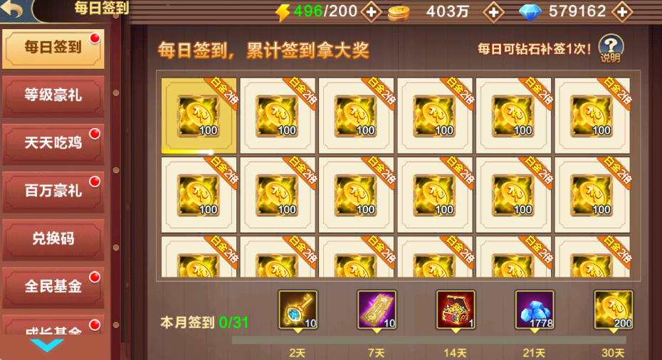 游戲內(nèi)簽到活動,每天簽到贈送大量刷充幣。