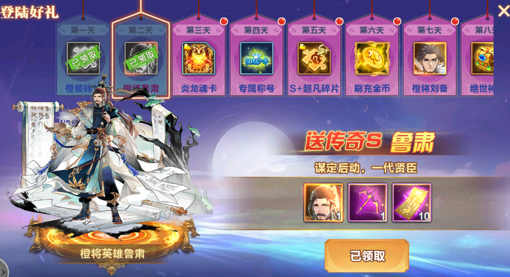 新服登錄活動,登錄2天送傳奇s英雄魯肅,登錄7天送強力劉皇叔,還有更多的海量福利等你來領(lǐng)??!