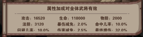 圣物:也是不需要等級就開放的,分別有橙色與紅色品質(zhì)的圣物,每個圣物的屬性都不一樣,有經(jīng)驗(yàn)加成的(如洛神賦、太平要術(shù))、有武將提示傷害(諸葛連弩)、有減傷的(昊天塔)等等;每個圣物也有不一樣的被動屬性,也有圣物共鳴加成;另外圣物屬性也是對全體武將生效;