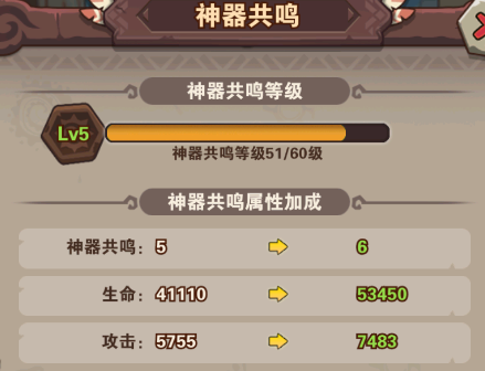 神器可通過強(qiáng)化提升等級,這邊建議是要平均升每一個神器的等級,有共鳴等級屬性加成的,而且也能增加每一個神器的屬性傷害。