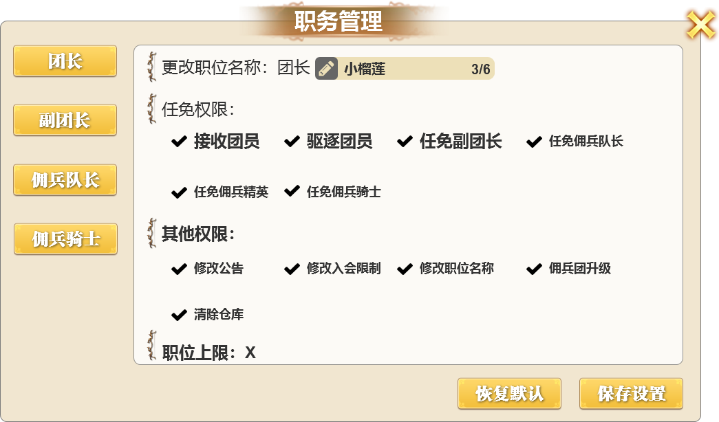 n?團(tuán)長(zhǎng)單獨(dú)權(quán)限,該權(quán)限允許團(tuán)長(zhǎng)自定義職位名稱,最大支持6個(gè)字且需要通過關(guān)鍵字檢測(cè)。