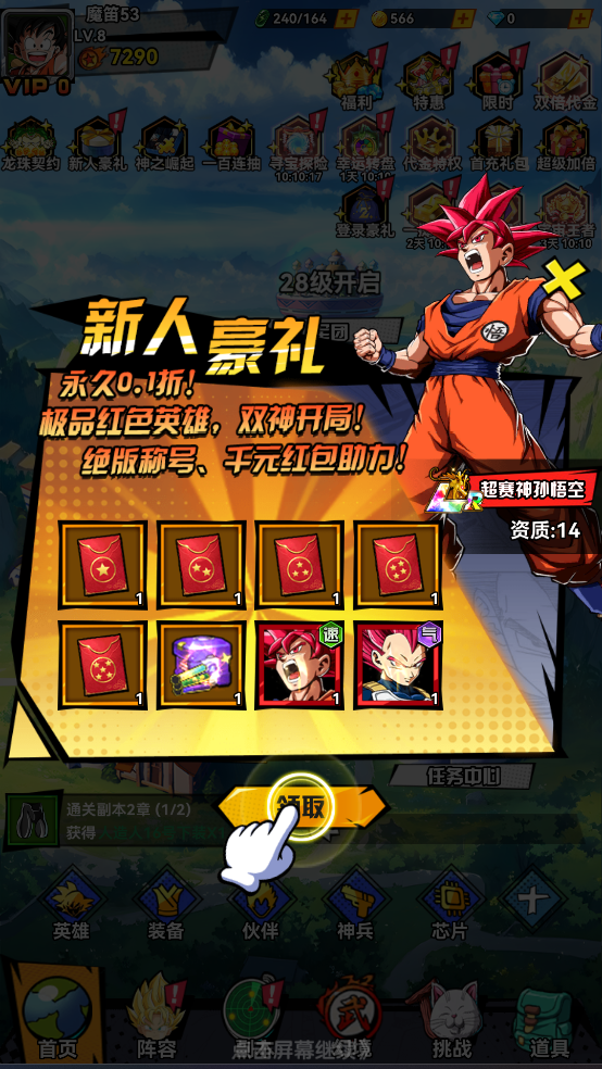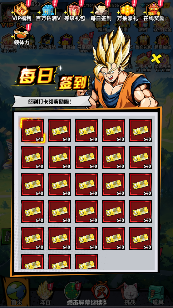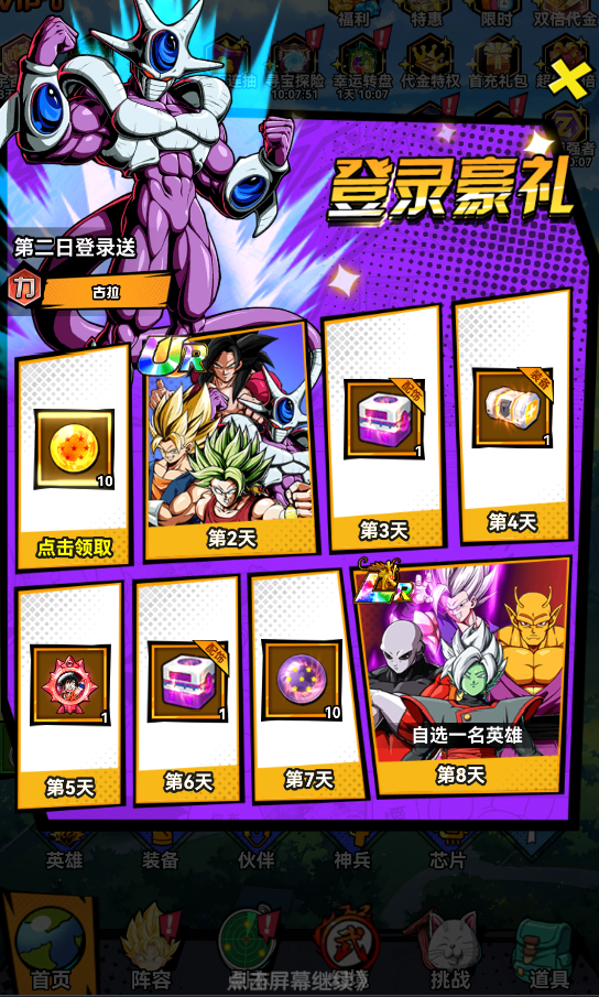 3、?八日簽到活動:主力橙色英雄自選、頂級配飾、頂級橙裝一套、小悟空紅色紋章,第8天更有頂級LR英雄自選!豪禮天天送!