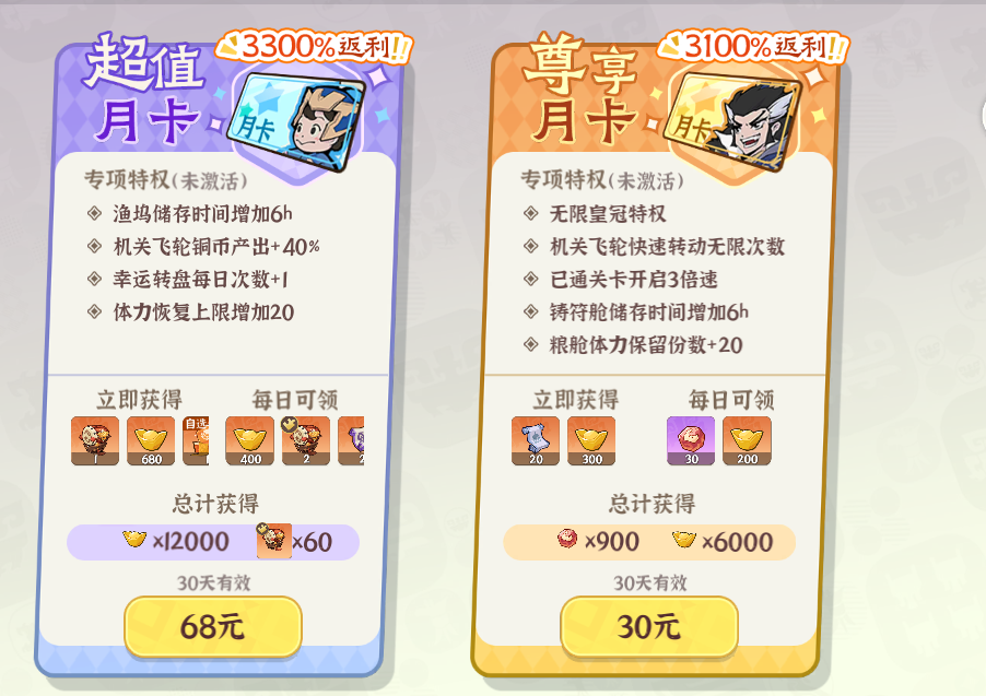 2.月卡&超值月卡:月卡和超值月卡不僅提供每日可領(lǐng)取的元寶和戰(zhàn)船藏品,同時(shí)還能夠加速戰(zhàn)斗和免除廣告;最重要的時(shí),在前期體力溢出時(shí),可以通過機(jī)關(guān)飛輪快速掃蕩領(lǐng)取大量養(yǎng)成資源,進(jìn)度上快人一步