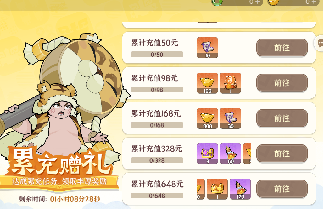 根據(jù)當(dāng)前累充額度距離下一檔累充獎(jiǎng)勵(lì)的差值,可以選擇購買一些小額禮包積攢累充進(jìn)度,白拿一檔獎(jiǎng)勵(lì)