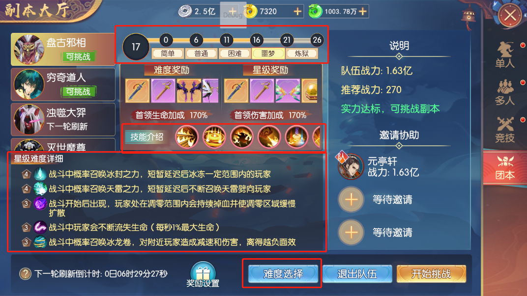 通過‘難度選擇’調(diào)整副本難度,‘難度獎勵’‘星級獎勵’會同時更改,難度越高獎勵越好