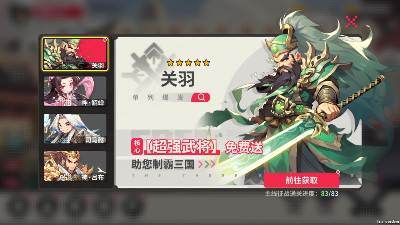完成指定任務(wù)可得強力五星武將關(guān)羽、司馬懿、神·貂蟬以及神·呂布,助主公,制霸三國。