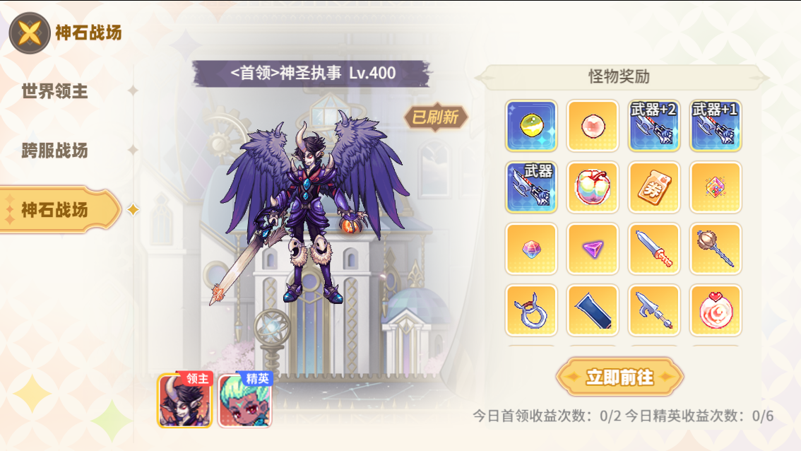 挑戰(zhàn)神石戰(zhàn)場的首領和精英可獲得對應獎勵,首領:傷害排名最高的個人或隊伍可獲得神石首領獎勵;精英:最后擊殺者可獲得精英獎勵。玩家每日可挑戰(zhàn)神圣戰(zhàn)場次數(shù)有限,超過次數(shù)將無法造成傷害無法獲得獎勵。