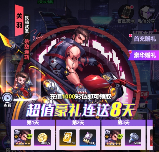 2、前8天累充滿100元可以額外解鎖首充的3個(gè)ss核心關(guān)羽本體+50抽;