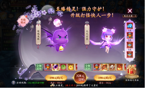 購買至臻精靈直購,購買完次數(shù)可獲得50個(gè)狂歡經(jīng)驗(yàn)丹,使用后可將等級從120級提升至161級