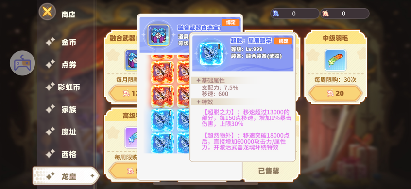 建議大家把每個星座都先升到15級再進行點化,然后激活星圖屬性,后續(xù)可以根據(jù)自身需求來著重提升某個星圖,這邊建議提升風象星圖,可以增加移速,煉獄龍皇殿會產(chǎn)出融合寶箱,可以給用來給武器防具融合增加屬性,超脫套裝可以用來增加移速,達到18000移速后還會有武器龍魂環(huán)繞特效哦。